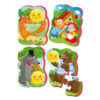 Мягкие объемные детали из вспененного полимера. Пазлы разделены на 3-5 элементов. Возраст 2-3 года. Вид упаковки: пакет с клапаном. Особенность: в 1 упаковке — 4 пазла.