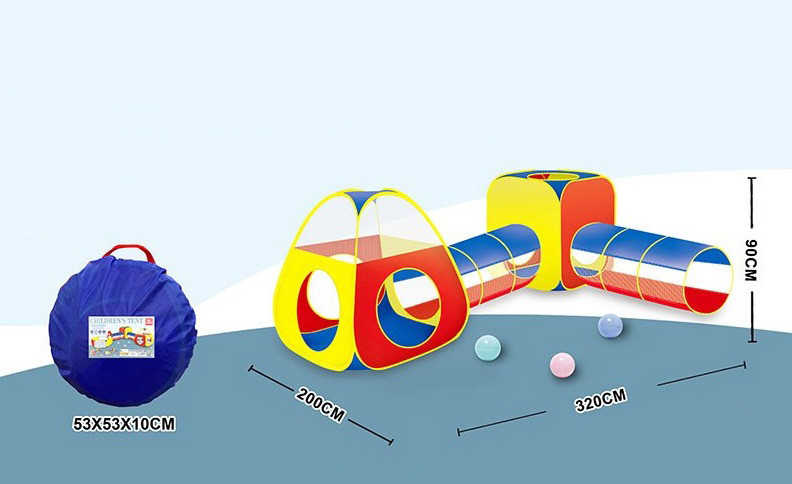 Детская палатка с тоннелем – это две отдельные палатки, которые соединяются между собой трубой (тоннелем). Каждую палатку ваш малыш сможет оформить по-разному. В одной из них можно сделать игровой домик ,в другой –«сухой бассейн», наполнив его специальными шариками для бассейна. Тоннель между домиками добавит активности и подвижности в игру вашего малыша. Детская палатка просто и удобно устанавливается за счет легкого самораскрывающегося механизма. С палаткой удобно путешествовать, так как она собирается в компактную и легкую для транспортировки сумку.