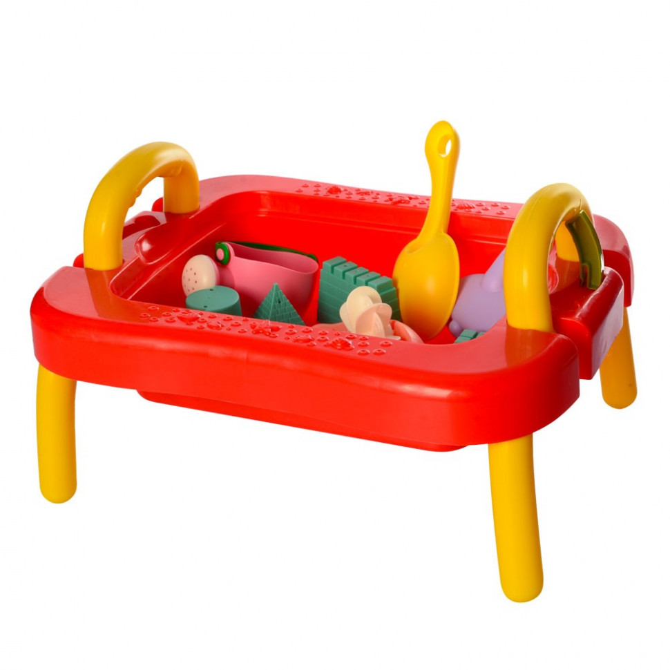 Главным преимуществом данной модели является ее мобильность. Песочница имеет удобный размер 41х15х32 см., но при этом вмещает в себе достаточное количество песка для увлекательной игры. Игрушка снабжена ручками для переноски, и ножками, которые превращают ее в удобный столик. Несмотря на свою компактность, игрушка обладает всеми качествами полноценной детской песочницы. Набор комплектован различными аксессуарами для игры с песком: лопатка, грабли, лейка и формочки для пасочек. Игровой столик-песочница может быть использован как внутри помещения, так и снаружи. Изготовленная из пластика песочница не боится влаги и неблагоприятных погодных условий. При необходимости она легко очищается с помощью воды или влажной губки. Игрушка изготовлена из качественных и безопасных для здоровья материалов. Износостойкие качества пластика обеспечат продолжительное время использования.