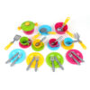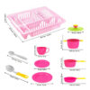 В наборе есть все, чтобы маленькая хозяюшка реализовала свои кулинарные замыслы. Кастрюлька и сотейник для вкусных борщей и полезных овощей, сковородка для жарки. Шумовка, черпак, большая вилка и лопатка сделают процесс приготовления максимально реалистичным. Также малыши смогут пригласить друзей на чаепитие с разноцветными чашками на блюдечках.