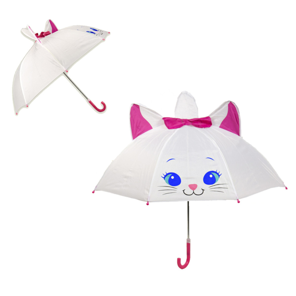Зонт детский Белая кошка Shantou (UM2610) — зонт-трость с удобным куполом, чтобы эффективно спрятать ребенка от дождя. На белом куполе нарисовано лицо милой кошечки, а также есть объёмные ушки и челочка с бантиком. Зонт удобен и практичен, он имеет пластиковые спицы, за счет чего зонт очень легкий. Длина: 60 см. Диаметр купола: 70 см.