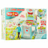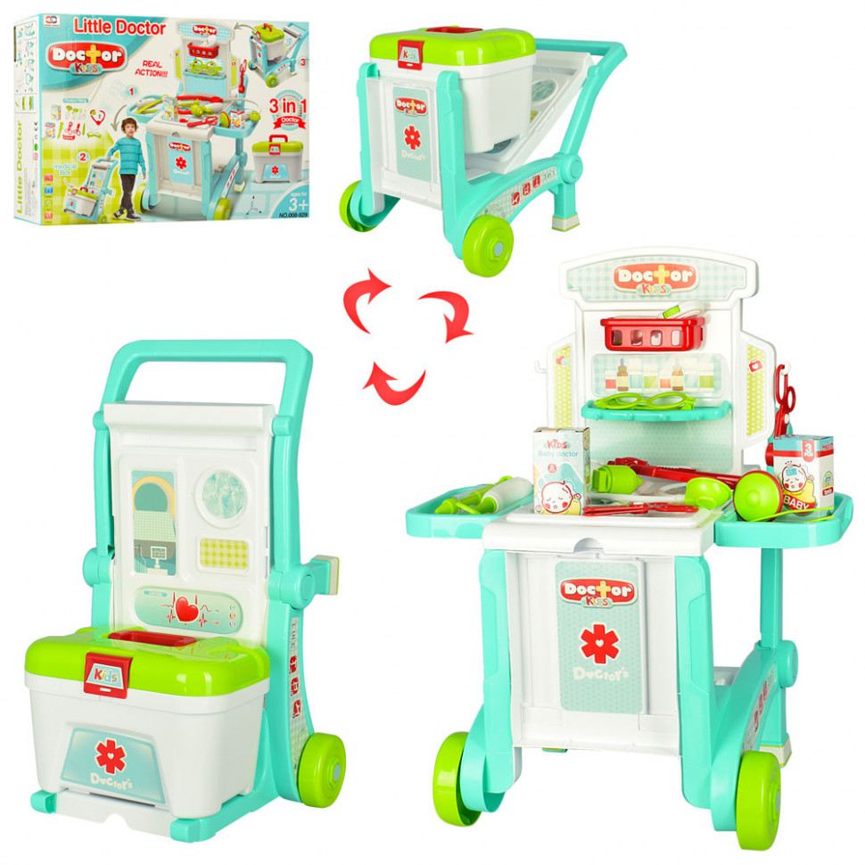 Передвижной докторский столик с чемоданчиком и оборудованием. В наборе есть необходимые для оказания медицинской помощи и обследования инструменты такие как: градусник, шприц, ножницы, стетоскоп, молоточек, пинцет, докторские очки, ножницы-зажим. Столик может трансформироваться передвижную конструкцию с помощью которой можно перемещать чемодан с инструментами. В наборе так же есть наклейки медицинской тематики которые ребёнку необходимо наклеить на столик. Высота столика 42 см.