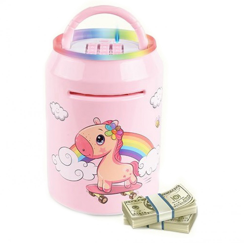 Копилка-сейф с музыкой и светом. Данная копилка-сейф оснащена специальным механизмом, который срабатывает при поднесении купюры к купюроприемнику и затягивает ее внутрь, помещая в основное отделение копилки. Работает от батареек.