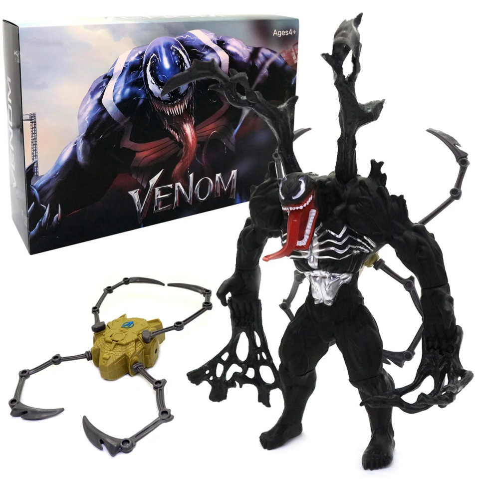 Фигурка Веном с аксессуарами отлично выполнена, практична и выглядит по-настоящему круто. Руки, ноги, голова и тело двигаются. На спину цепляется рюкзак с музыкальными эффектами и супер-ножами. А из-за спины и с рук может выпускать свое биологическое оружие. Полное соответствие экранному образу.