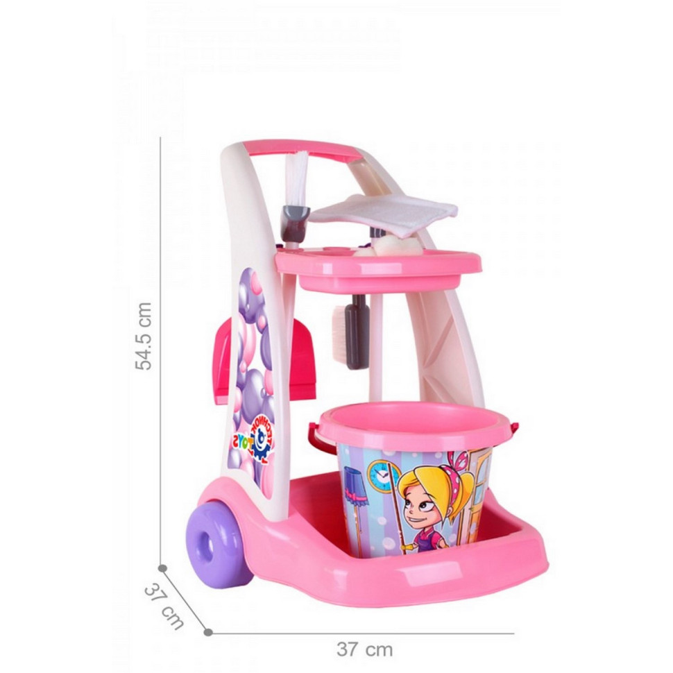 В «Наборе для уборки» есть яркое ведерко с красочной наклейкой, выполненной с помощью технологии IML, швабра, метла, щеточка и совок. Все элементы можно разместить на тележке и перевозить с собой. На нижней полке тележки есть специальное место для ведерка, а на верхней полке с тремя крючками удобно разместить мелкие элементы набора. С такой тележкой все необходимое всегда будет под рукой. Тележкой можно пользоваться как дома, так и на игровой площадке. А как использовать тележку на улице малыш с друзьями решит сам, ведь перевезти на этой коляске можно много.