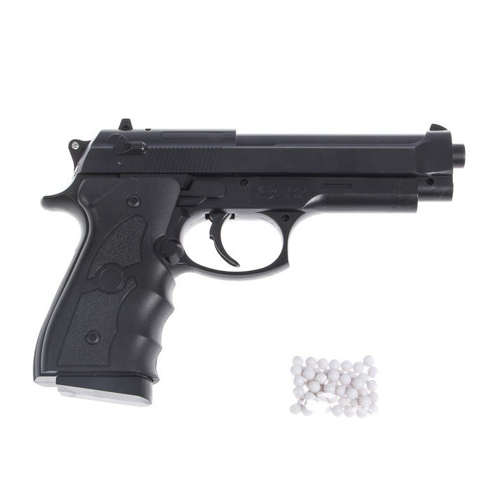 Пружинный пистолет является копией популярного пистолета Beretta 92, стоящего на вооружении армий и спецслужб многих стран .Корпус пистолета пластиковый. В магазин вмещается 14 шариков BB 6 мм.Выстрел из пистолета осуществляется с помощью пружины,максимальная начальная скорость выстрела не более 50 м/с. Прицельные приспособления не регулируемые, пистолет предназначен для стрельбы на короткие дистанции. Укомплектован имитацией глушителя