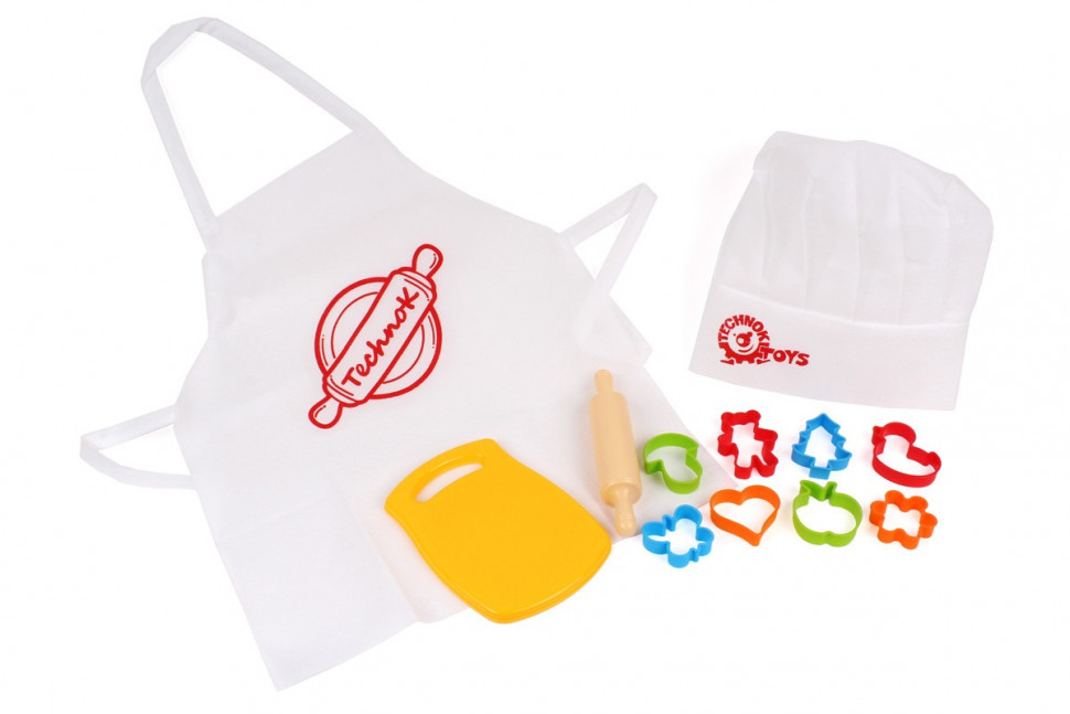 В наборе от ТехноК есть все необходимое для первых кондитерских шедевров: 8 цветных формочек, дощечка и скалка. Можно вырезать пирожные различной формы, выбрав что Вам нравится. С такой игрушкой Ваш малыш почувствует себя профессиональным шеф-поваром, поскольку в наборе есть белый фартук с ярким рисунком и настоящий поварской колпак. На помощь маме добавляем рецепт вкусной выпечки. Пирожные с шоколадом, орешками или изюмом — решать это только маленьком шефу!