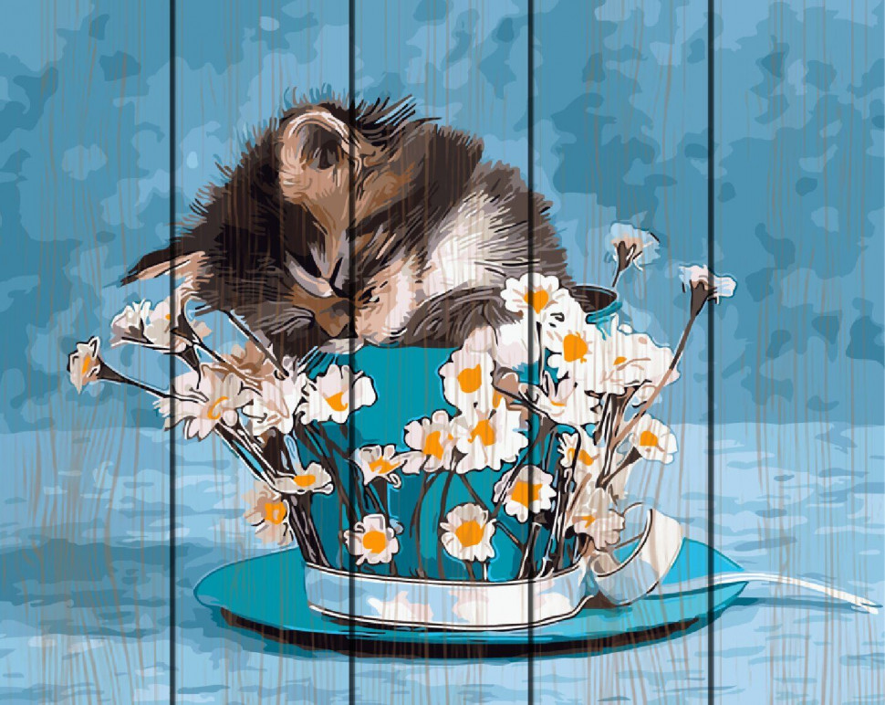 Картина по номерам на дереве. Rainbow Art «Котенок в ромашках»