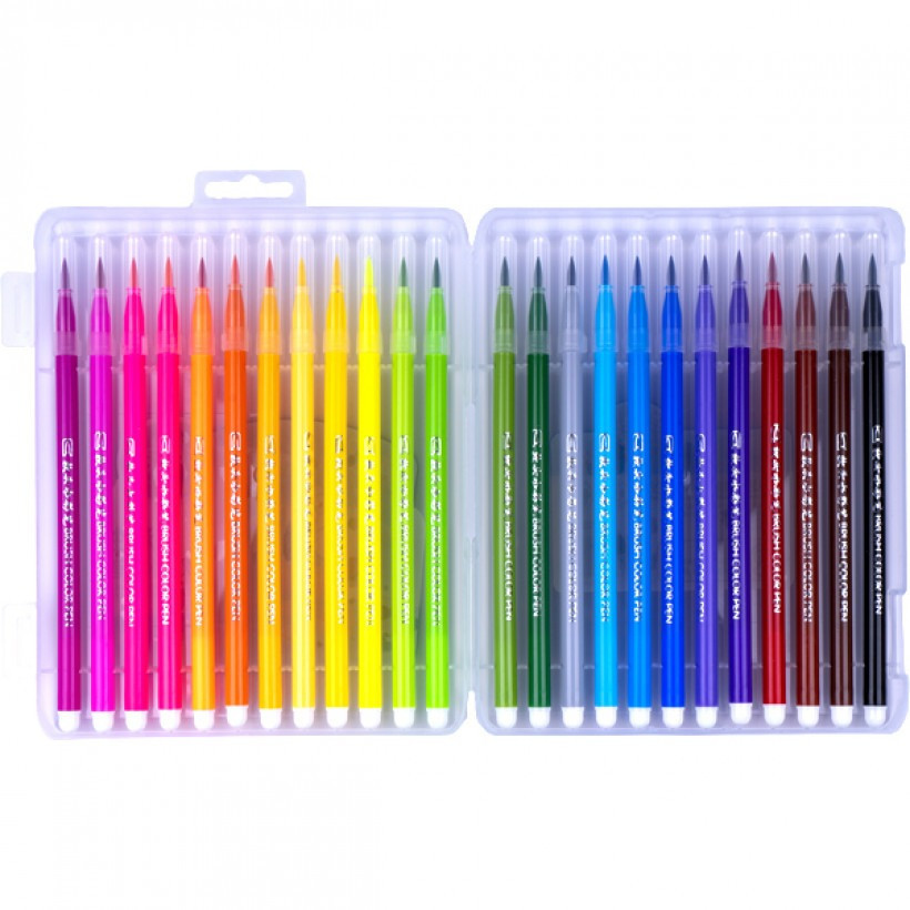 Фломастер -кисточка 24 цвета. Пишущий узел в форме кисточки позволяет наносить линии от 1 мм до 4 мм. Яркие насыщенные цвета. Чернила на водной основе.