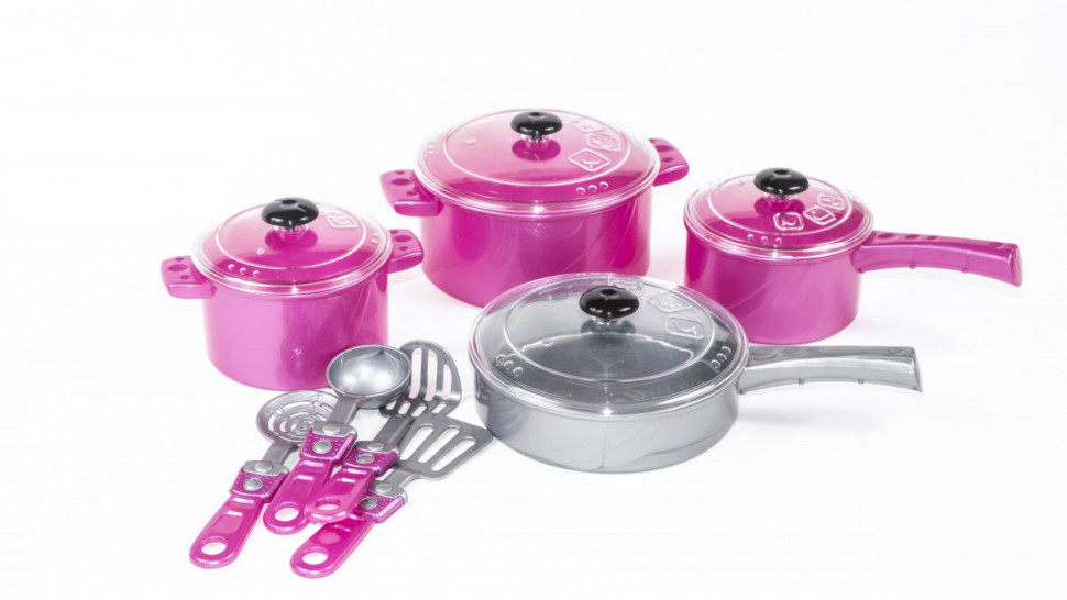 Набор яркой пластиковой посудки. В комплекте: большая кастрюлька с крышечкой, маленькая кастрюлька с крышечкой, маленькая кастрюлька с ручкой и крышечкой, большая сковородка с крышечкой и 4 прибора для готовки.