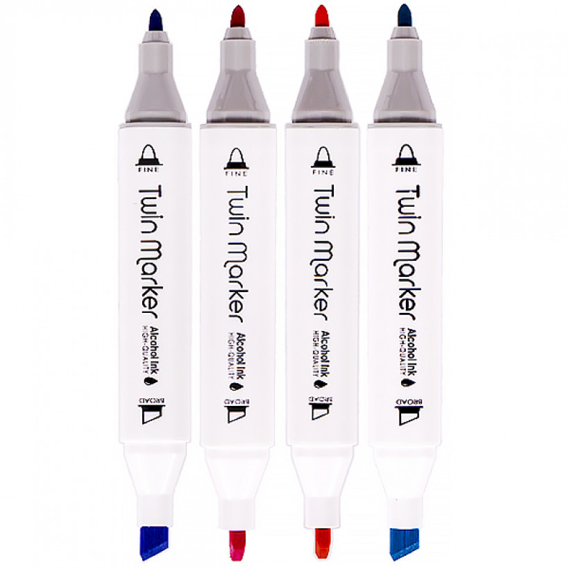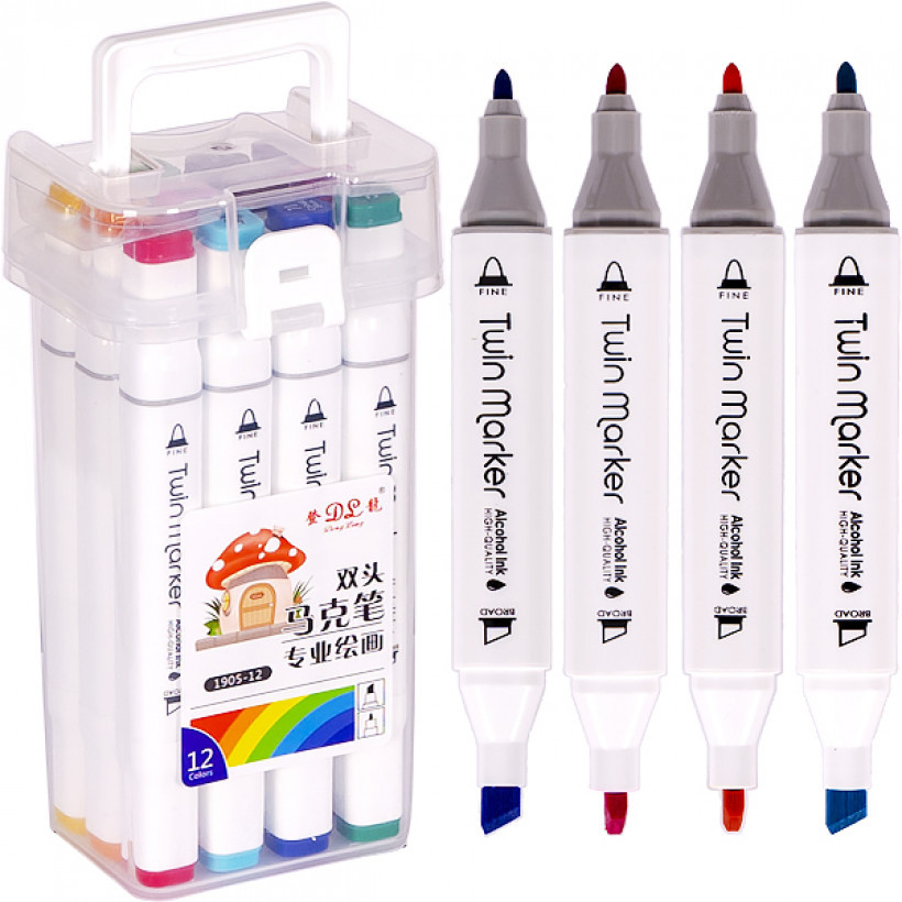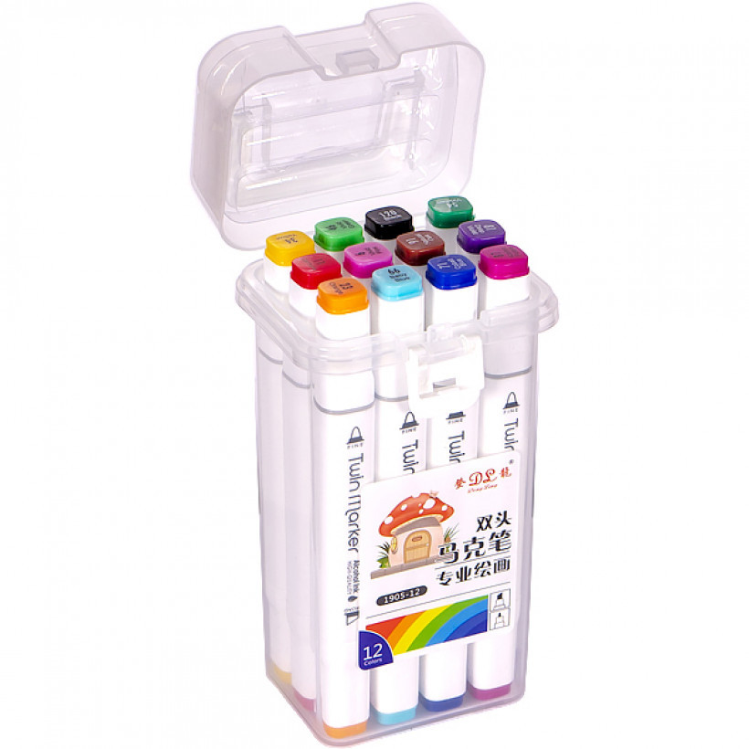 Набор двухсторонних фломастеров/скетч маркеров на спиртовой основе. В наборе 12 штук в пластиковом футляре. С одной стороны обычный фломастер, с другой стороны скошенный маркер. Каждый цвет имеет свой цифровой код, который нанесен на колпачок маркера. Колпочки плотно закрывают маркер, препятствуя высыханию. Чернила на спиртовой основе хорошо впитываются в бумагу, поэтому рекомендуется использовать плотные листы или картон.