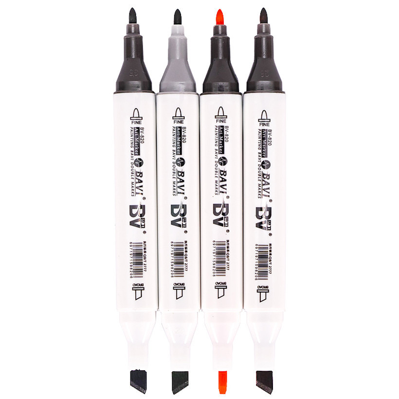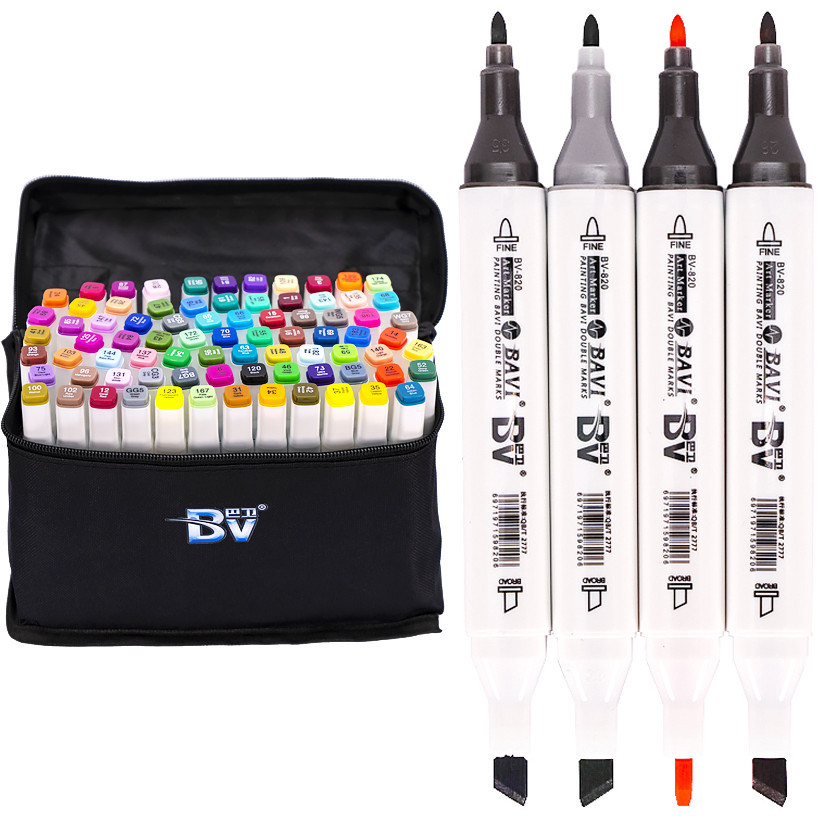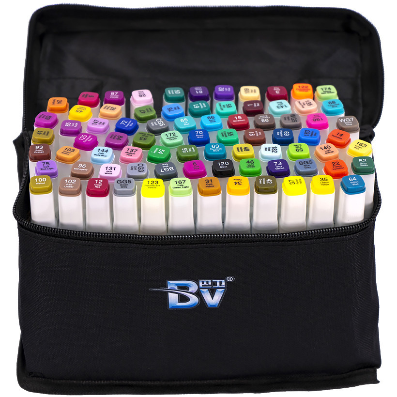 Набор двухсторонних фломастеров/скетч маркеров на спиртовой основе. В наборе 80 штуки в сумке. С одной стороны обычный фломастер, с другой стороны скошенный маркер. Каждый цвет имеет свой цифровой код, который нанесен на колпачок маркера. Колпочки плотно закрывают маркер, препятствуя высыханию. Чернила на спиртовой основе хорошо впитываются в бумагу, поэтому рекомендуется использовать плотные листы или картон.