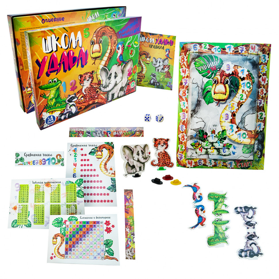 Подготовка к школьным занятиям и обучение счету в процессе увлекательной игры — это веселое развлечение для компании малышей от 2 до 5 человек «Школа Удава» (Strateg 30209). Мудрый Удав познакомит детей с цифрами и началами математики. Знание правил арифметики и действий с числами потребуются игрокам в процессе игры, в которой им помогут фишки в виде фигурок зверят – крокодила, слоненка, леопарда, попугая и енота. Суть игры – передвигать фигурки по игровому полю в зависимости от цифры на кубике, выполняя игровые задания на математическую тематику. Для помощи в выполнении заданий есть карточки-подсказки. Побеждает тот, кто первым придет к финишу или наберет максимальное количество очков. В инструкции приведены правила игры и как определить победителя. Язык русский.