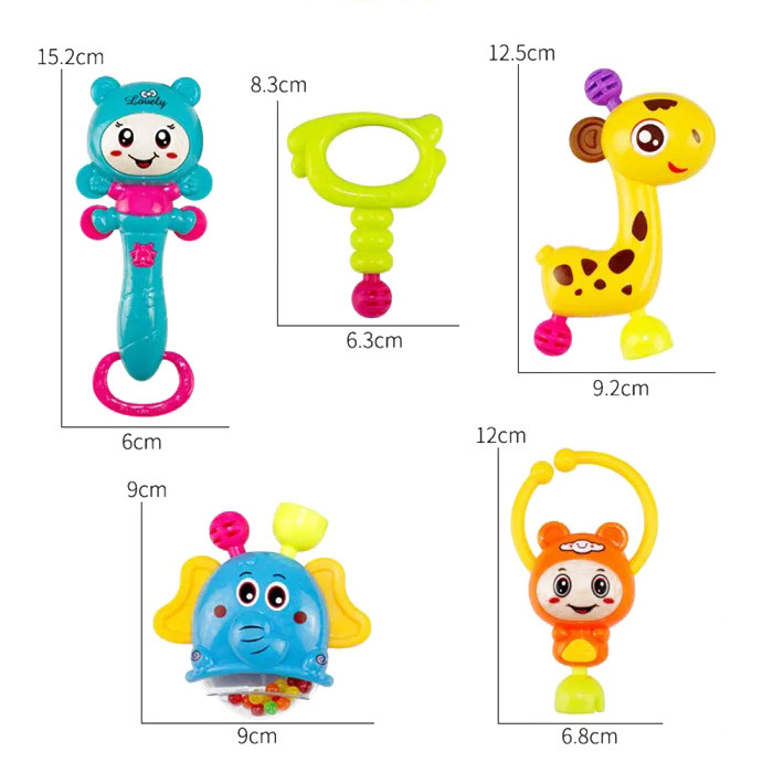 Погремушки сцепляются между собой, в комплект входит 8 игрушек.
