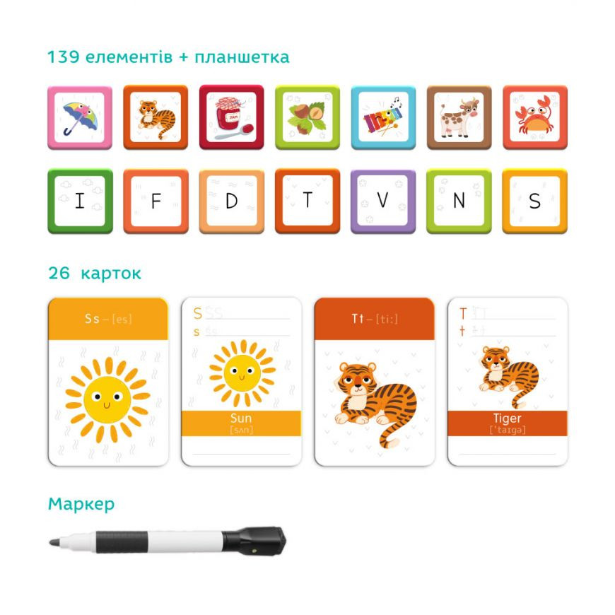Комплектация: 1 магнитная планшетка, 139 магнитных элементов, 26 карты, сухостиральный маркер.
