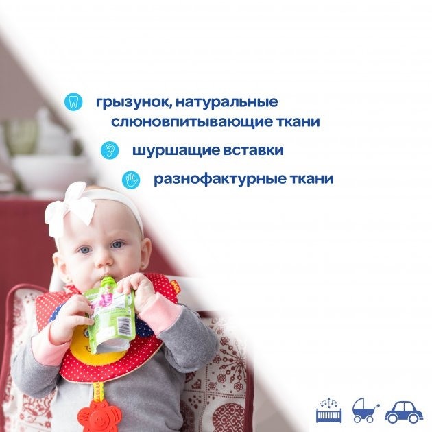 Пошит из 100% хлопка, с водонепроницаемой мембраной внутри, имеет удобное крепление на липучках. Слюнявчик можно использовать как во время кормления, так и в период прорезывания зубов. Он надежно защитит одежду крохи от загрязнений, а прорезыватель будет массировать и успокаивать десны. Ткань быстро впитывает слюнки малыша, так что одежда остается сухой.
